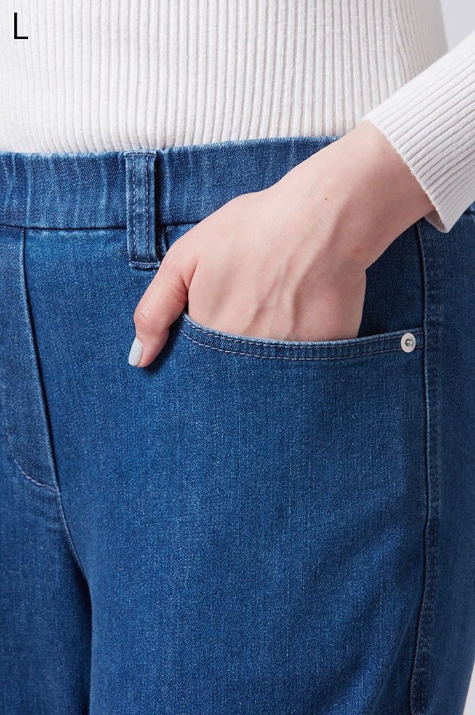 横ストレッチが効いており、ウエストゴムで快適な着心地を実現。