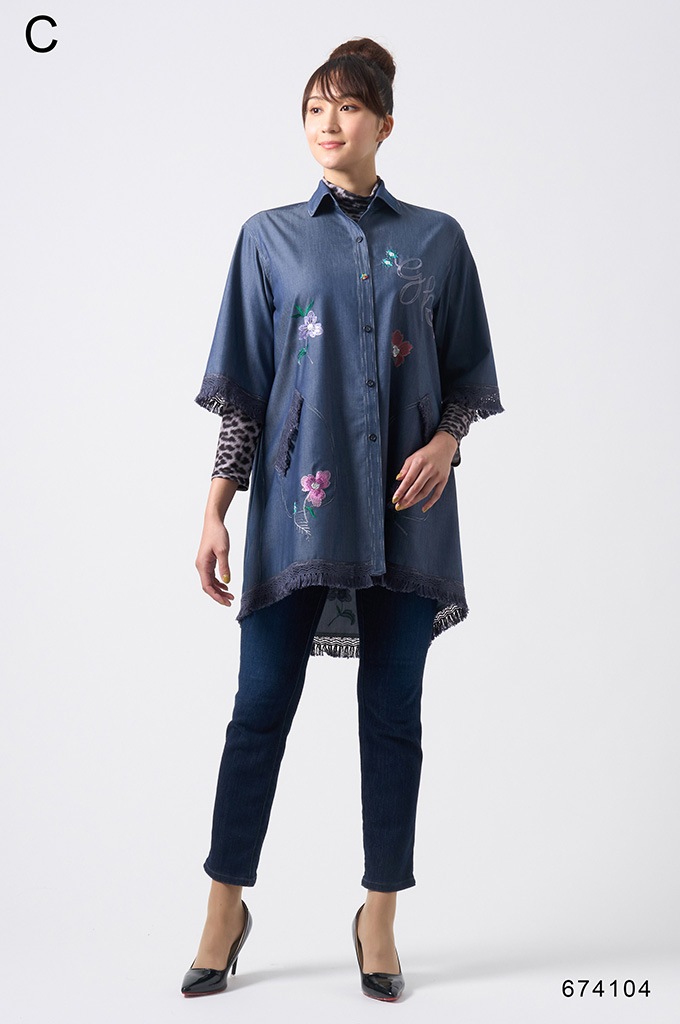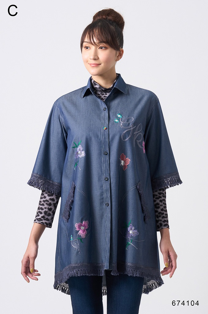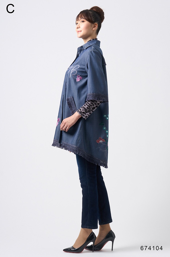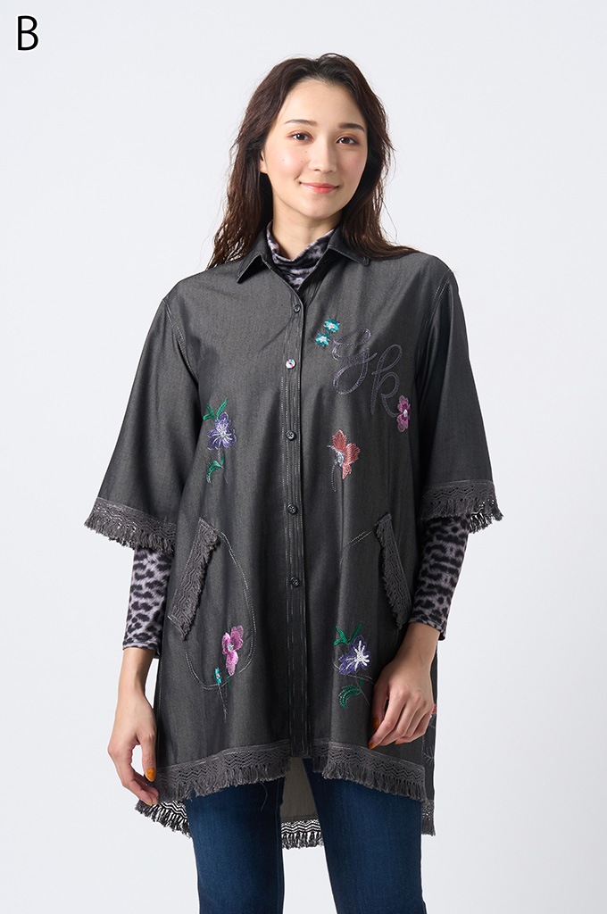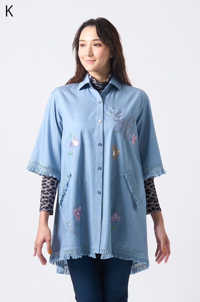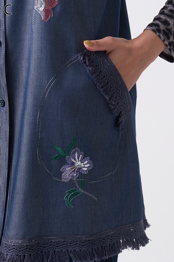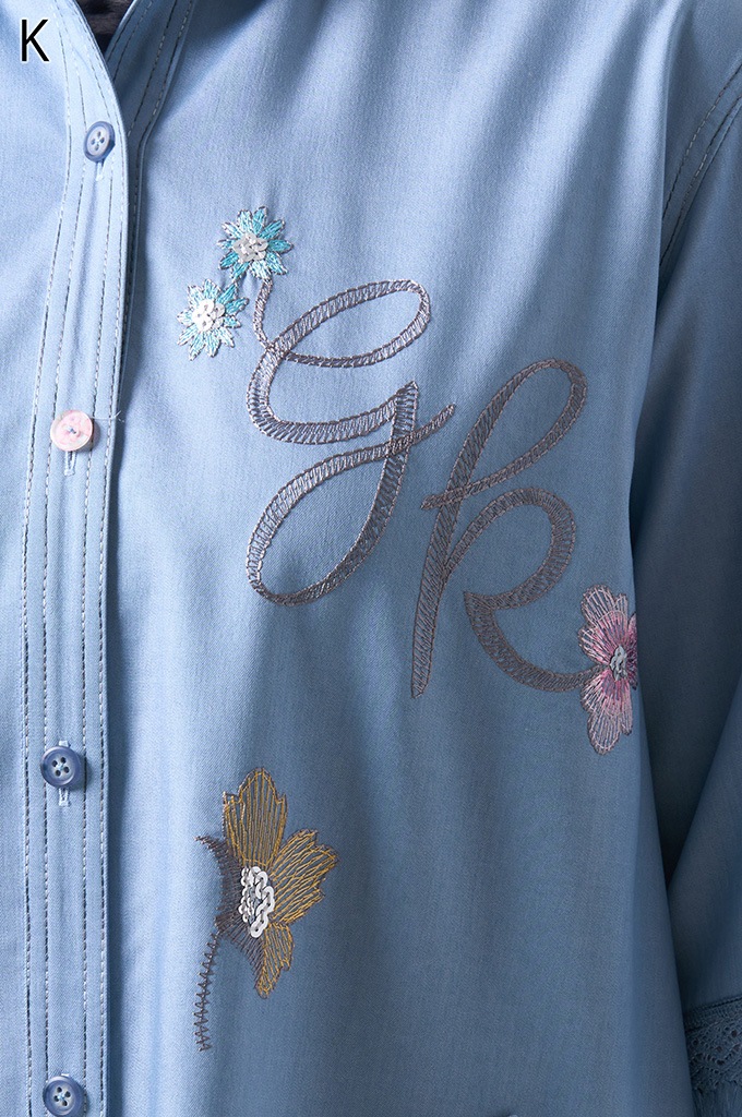 ソフトな風合いのデニム素材を使用し、女性らしさを引き立てる花とスパンコールの刺しゅうが魅力。