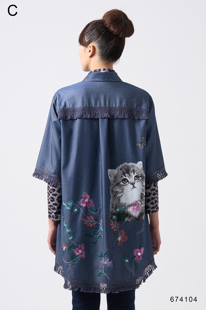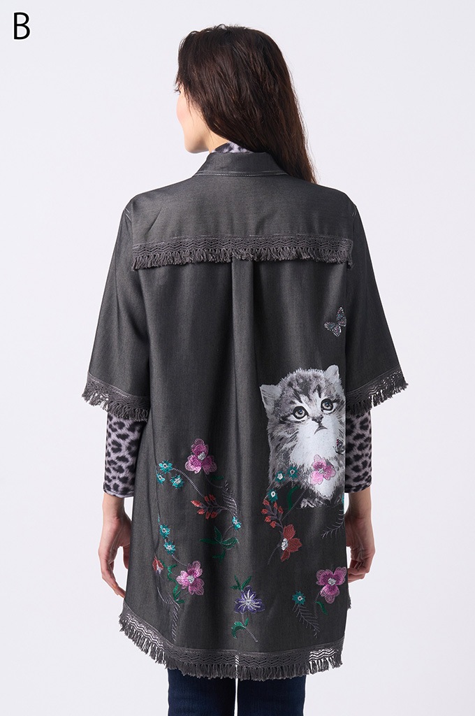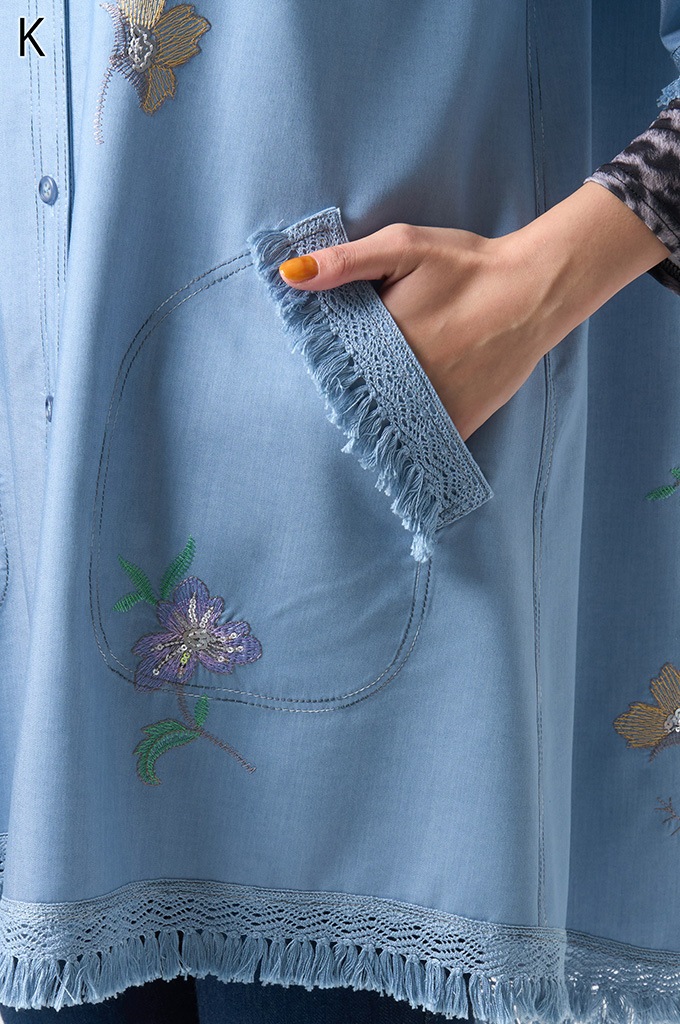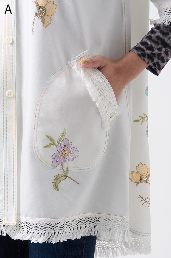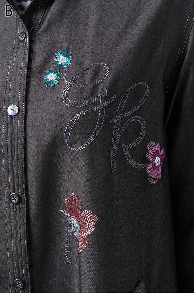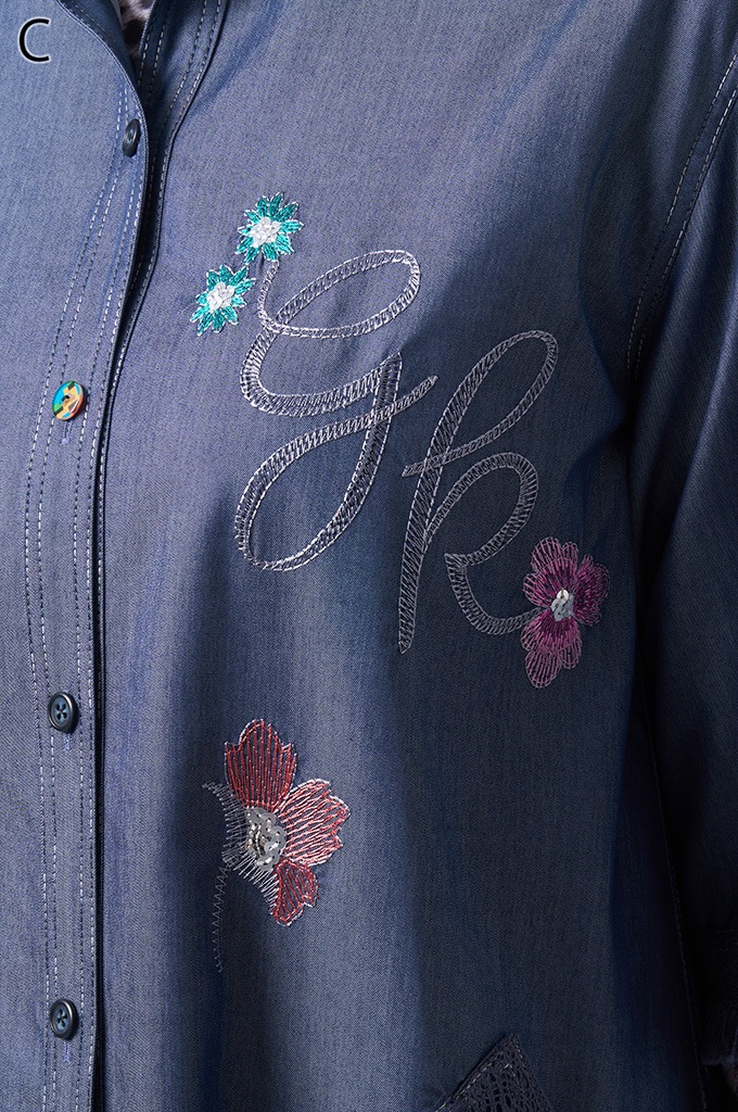 ソフトな風合いのデニム素材を使用し、女性らしさを引き立てる花とスパンコールの刺しゅうが魅力。