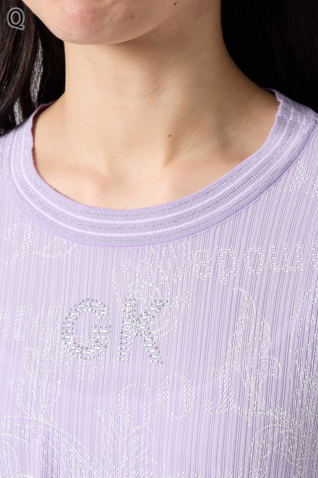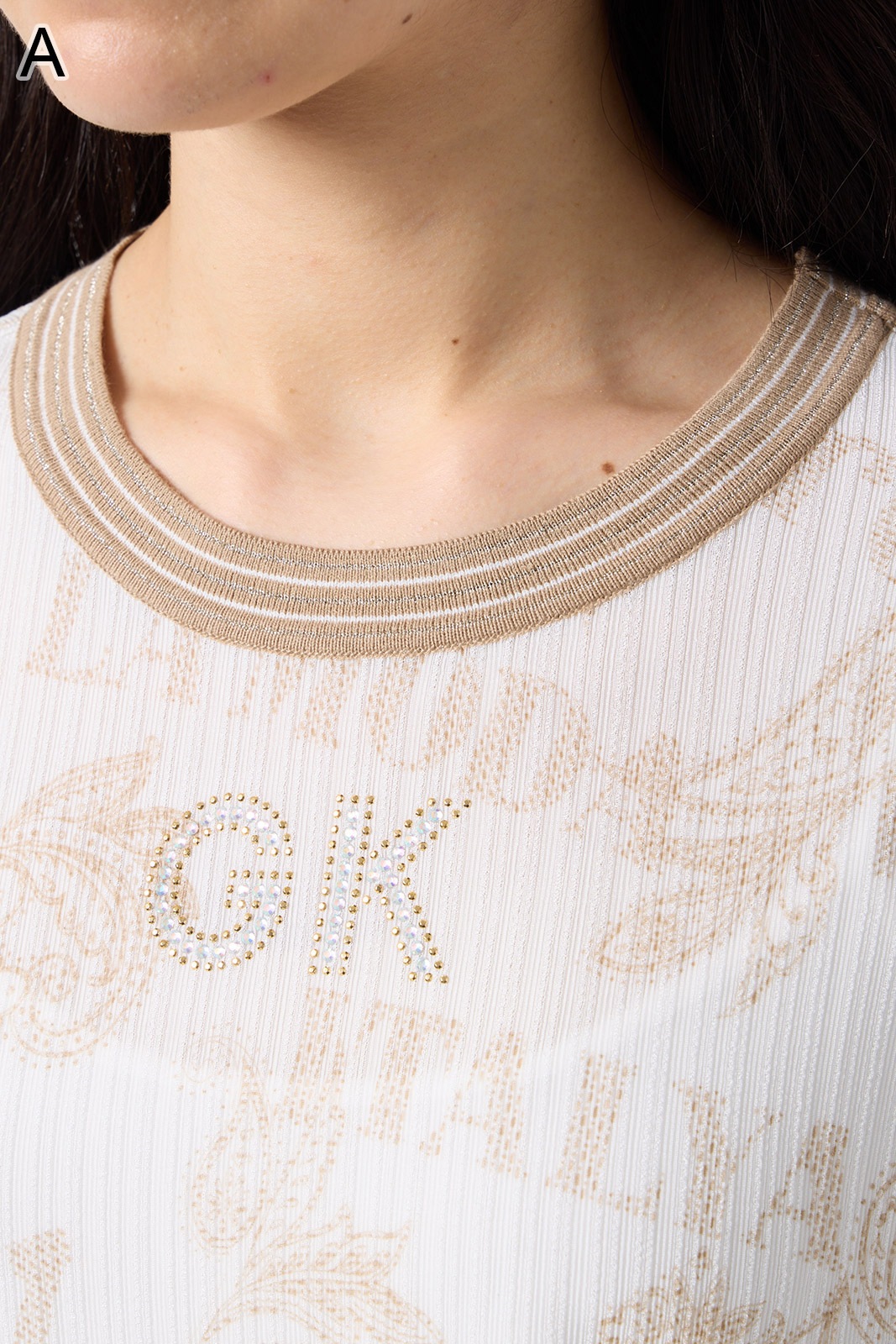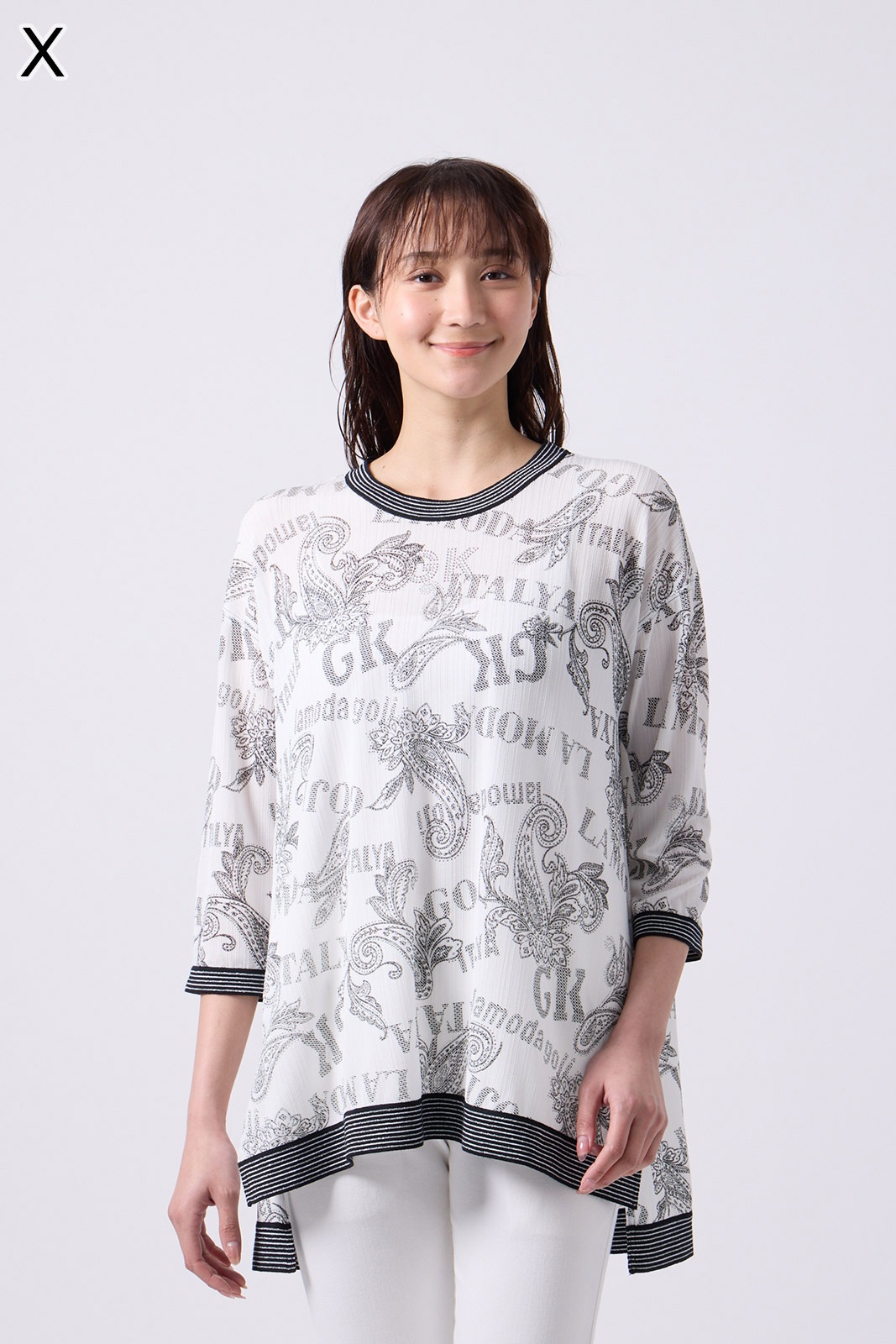 オリジナルロゴとペーズリープリントが華やかなストレッチ素材のTシャツ。